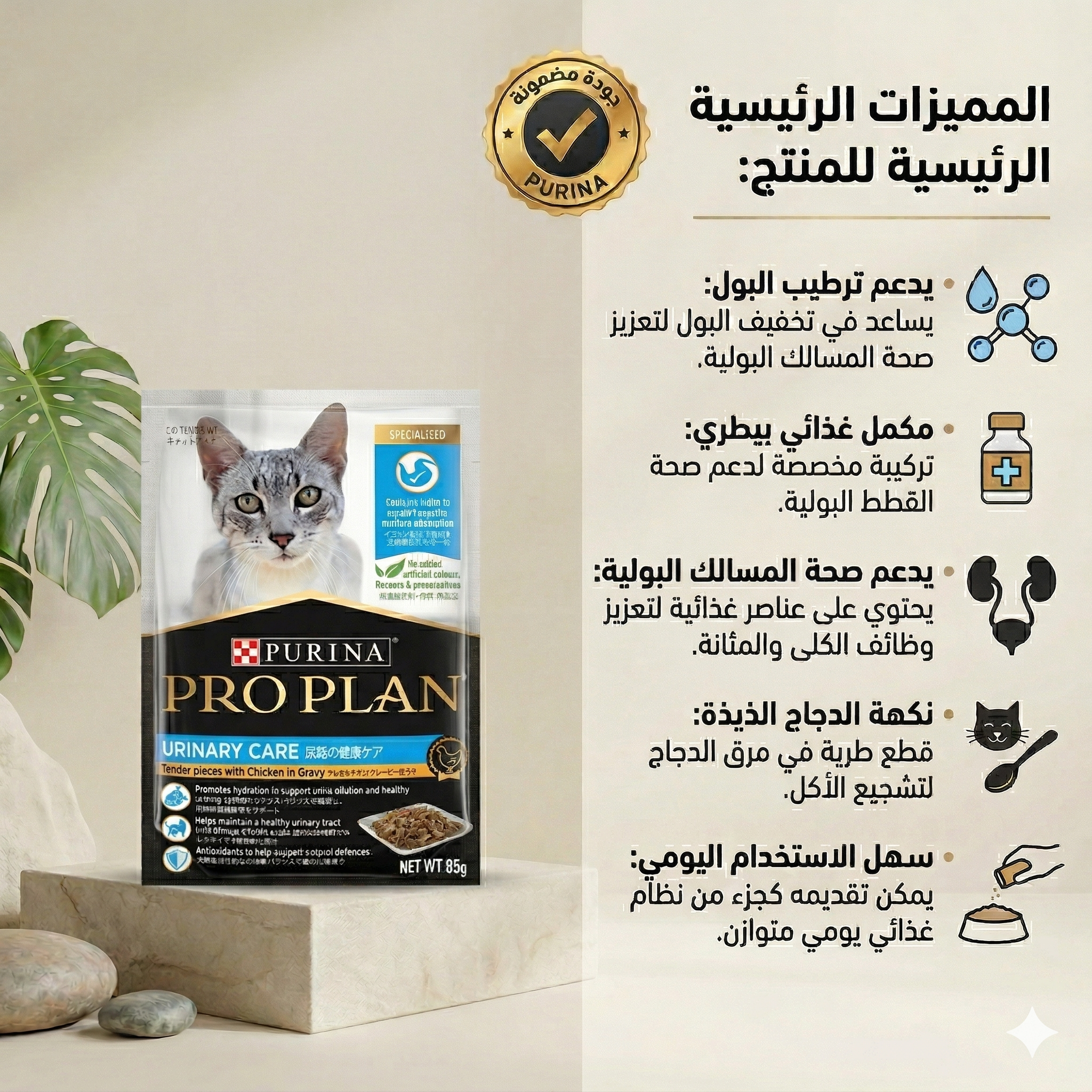 يعتبر نظام برو بلان يوريناري (Urinary) حلاً غذائياً متطوراً؛ حيث يجمع بين الدجاج الحقيقي في مرق لذيذ لتعزيز الترطيب وتخفيف البول، مع مستويات دقيقة من البروتين والدهون للمساعدة في الحفاظ على وزن صحي، مما يقلل الضغط على أجهزة الجسم الحيوية.