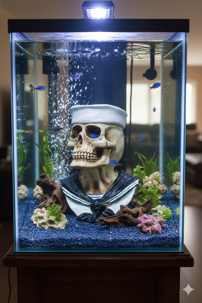 ديكورات الجمجمة في أحواض السمك شائعة وتستخدم لإضفاء طابع غامض، تاريخي، أو قرصاني (Pirate Theme) على الحوض. هي قطعة وظيفية بقدر ما هي جمالية.
