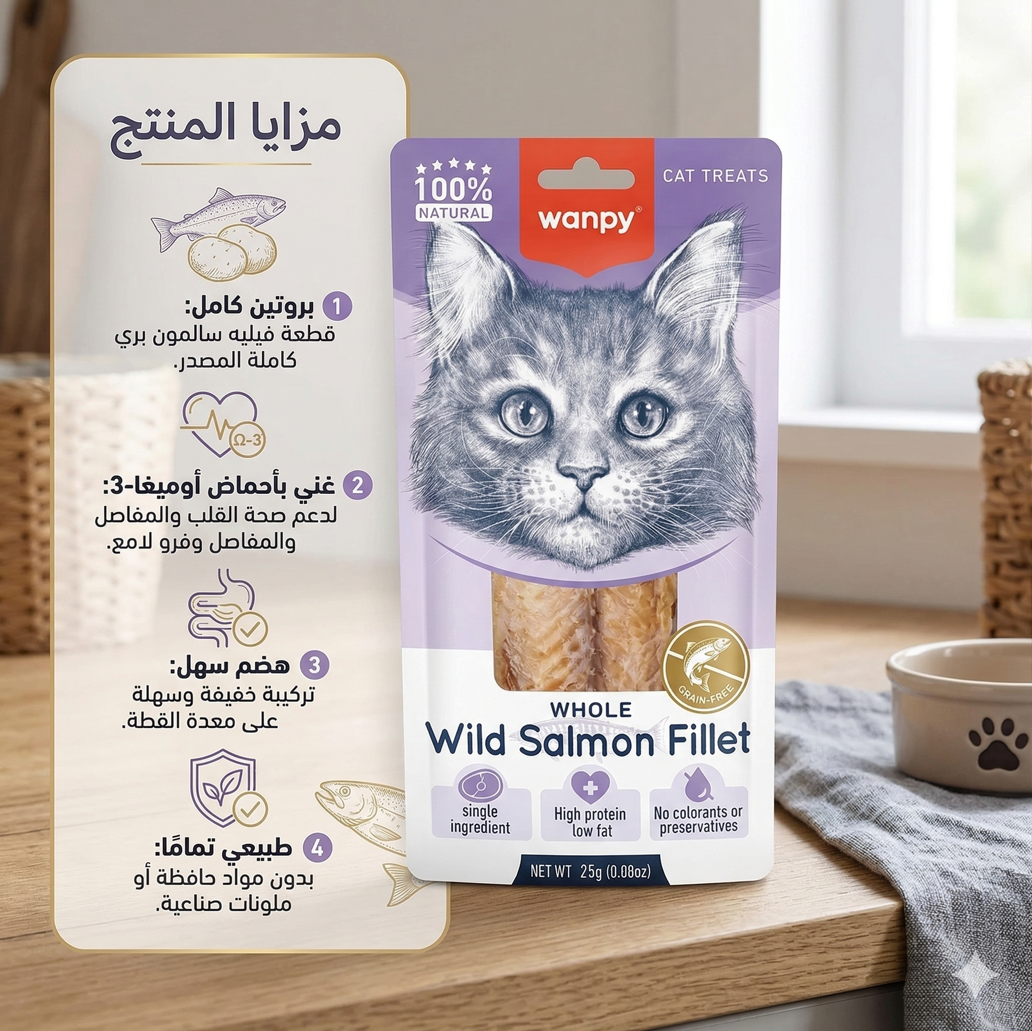 تعتبر مكافآت ونبي (Wanpy) من سمك الإسقمري (Mackerel) خياراً ذكياً للمربين؛ فهذا النوع من الأسماك معروف بغناه الطبيعي بالزيوت الصحية والبروتينات سهلة الهضم، مما يجعله سناكاً مثالياً يجمع بين المتعة والفوائد الطبية لجلد وفراء قطتك.