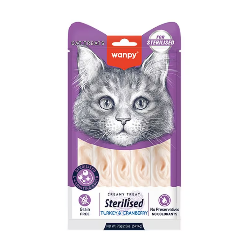 بعد عملية التعقيم، تتغير احتياجات القطة الغذائية وتصبح أكثر عرضة لزيادة الوزن ومشاكل المسالك البولية. تقدم مكافآت ونبي (Wanpy) حلاً ذكياً بتركيبة منخفضة السعرات الحرارية ومعززة بـ التوت البري المعروف بخصائصه الفائقة في دعم صحة المثانة ومنع الالتهابات.