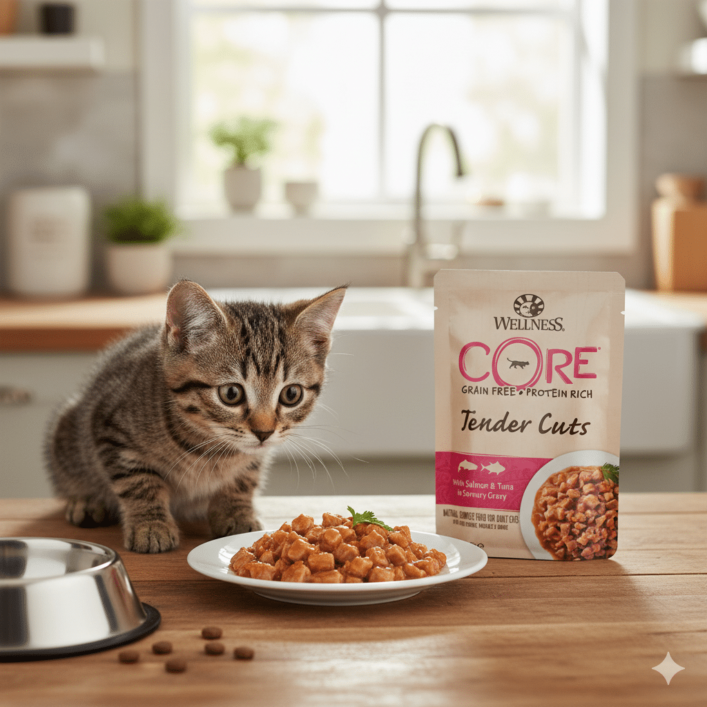 دلّل قطتك بأفضل تغذية مع أظرف Wellness CORE التي تحتوي على خليط غني من التونا الطازجة والسلمون في مرق شهي يضمن ترطيب جسمها وتزويدها بالطاقة.