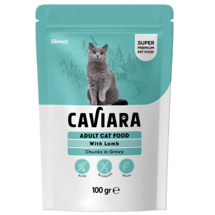 كافيارا طعام رطب للقطط البالغة، قطع لحم الحمل والدجاج في المرق، ظرف 100 جرام.