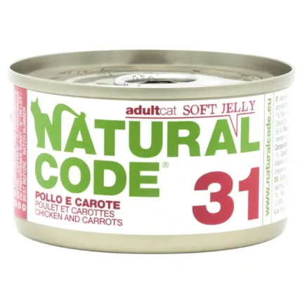 امنح قطتك البالغة وجبة متوازنة ومغذية مع طعام ناتشرال كود الرطب بالدجاج والجزر في الجيلي 85 غ (رمز 31). تجمع هذه الوصفة بين اللحم الأبيض الخفيف والفوائد الغذائية للخضروات، مقدمةً في قوام الجيلي المرطب الذي يرضي شهية قطتك.